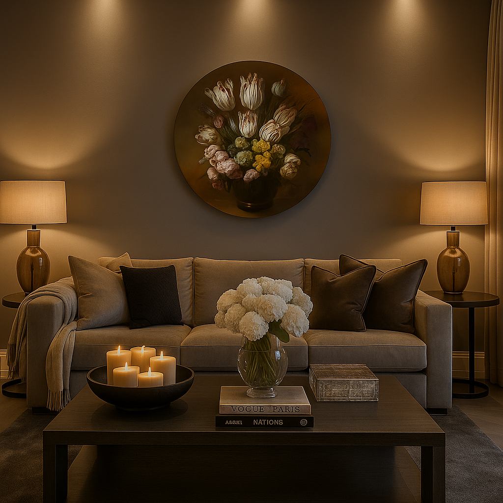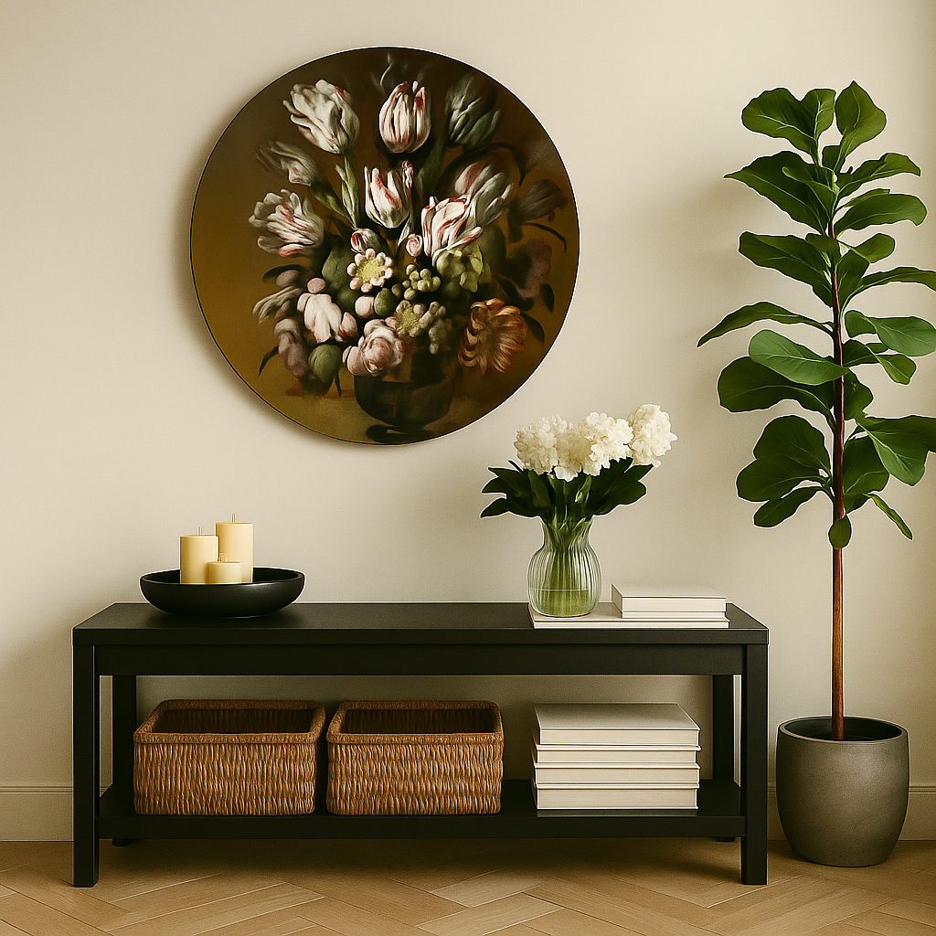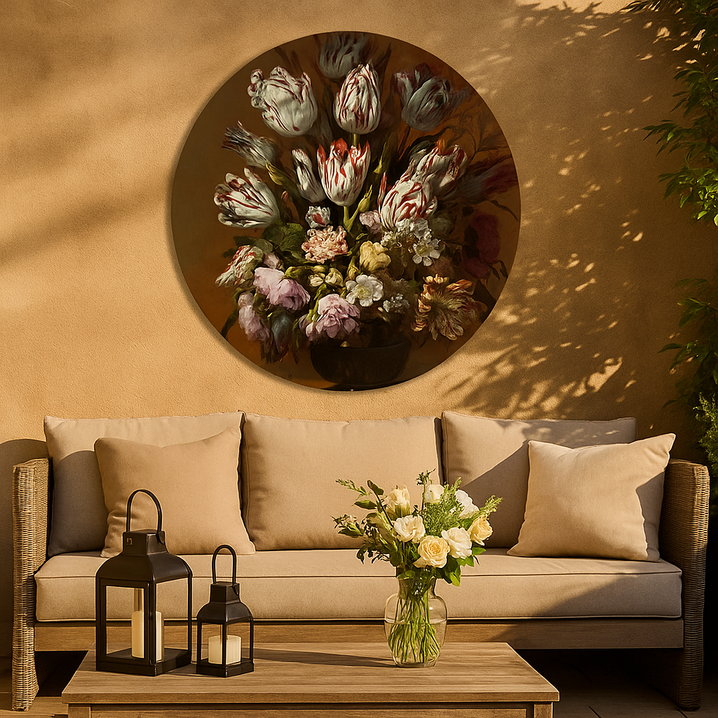 Breng de pracht van de Gouden Eeuw in huis met deze muurcirkel van Hans Bollongier. Het bloemstilleven uit 1639 komt op Dibond prachtig tot zijn recht en geeft je interieur een klassieke, luxe uitstraling. De rijke kleuren en verfijnde details maken dit kunstwerk een echte blikvanger. Wat is Dibond? Dibond is een aluminium paneel met een kunststof kern. Dat maakt het extra stevig, maar toch licht in gewicht. Het materiaal buigt niet, is vochtbestendig en geeft je afbeelding een strakke, matte afwerking. Ideaal dus voor zowel binnen als buiten. Waarom jij deze muurcirkel wilt hebben: